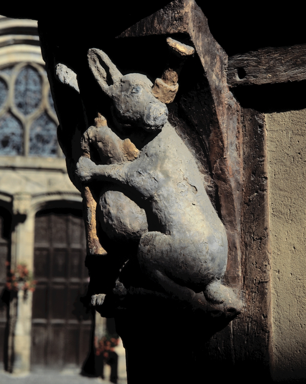 Angle sud-ouest, rez-de-chaussée, décor de l'aisselier du poteau cornier : lièvre jouant de la cornemuse (état en 1988)Immatriculation