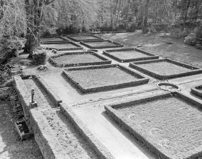 Jardin de buis et bassins : vue générale.Immatriculation