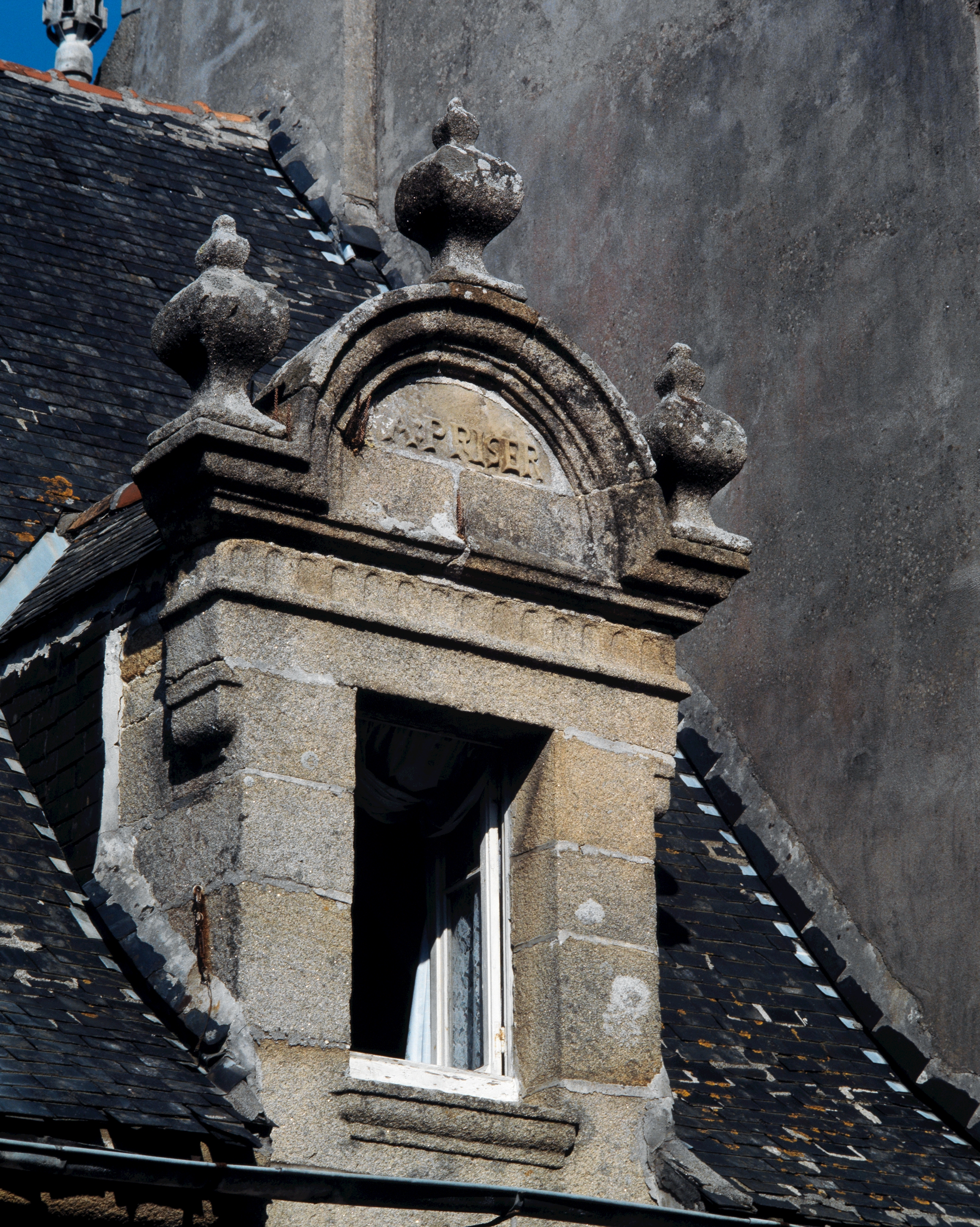 Elévation ouest, détail de la lucarne droite et inscription A : PRISER. (1989)Immatriculation