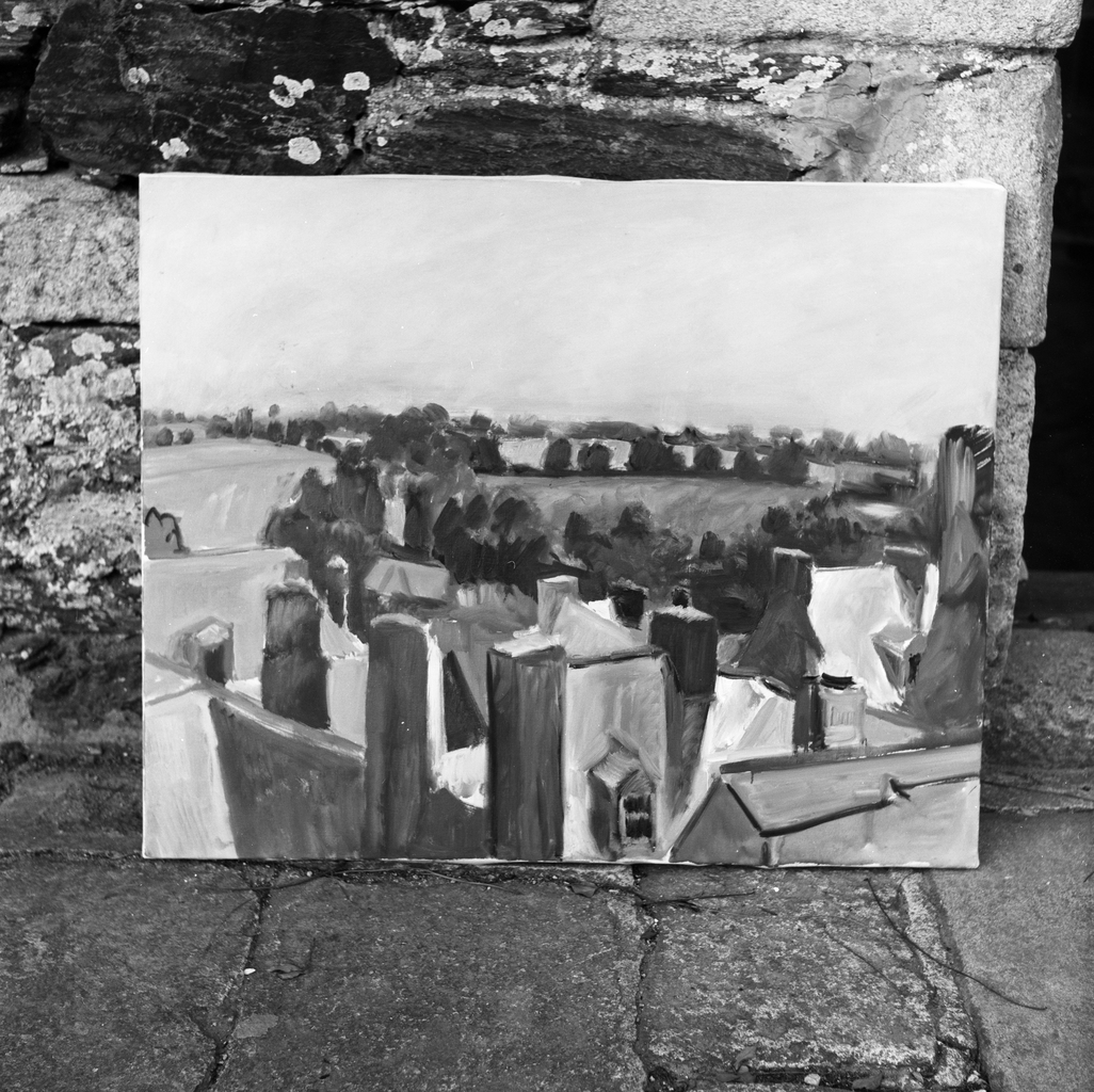 Château (loca : A/47), tableau : Paysage (cheminées, champs, arbres, toits de Rochefort-en-Terre)Immatriculation