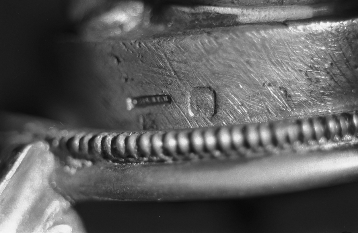Croix de procession - Détail du socle de saint Jean : marque rectangulaire au revers.Immatriculation