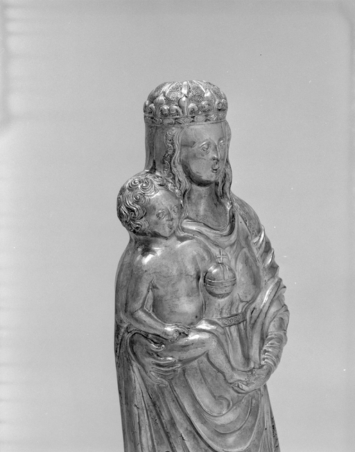 Statuette - Vierge à l'Enfant, détail du buste de trois quarts gauche.Immatriculation