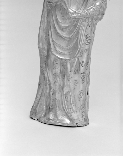 Statuette - Vierge à l'Enfant, détail de la robe fleurie : décor du bas jusqu'à la taille de face.Immatriculation