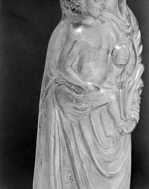 Statuette - Vierge à l'Enfant, détail des mains droites et des plis de la robe.Immatriculation