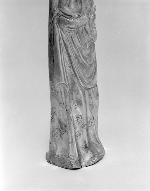 Statuette - Vierge à l'Enfant, détail de la robe fleurie : décor du bas jusqu'à la taille au flanc gauche.Immatriculation