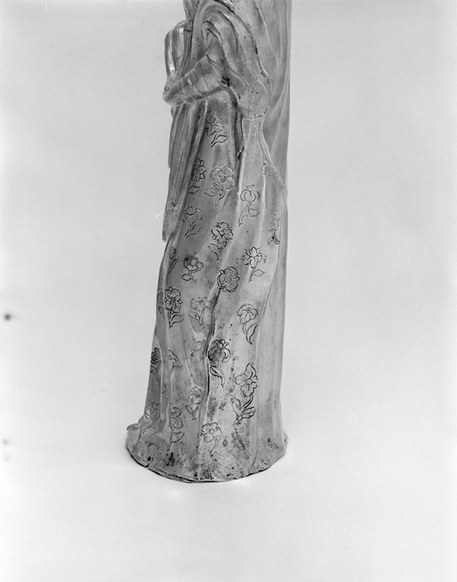 Statuette - Vierge à l'Enfant, détail de la robe fleurie : chute du voile côté droit.Immatriculation