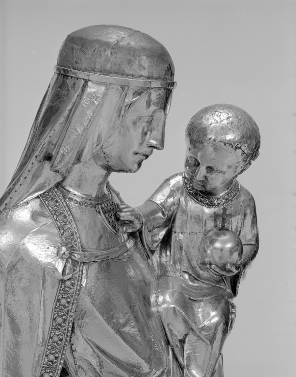 Détail des têtes (Vierge de profil et Enfant de face).Immatriculation