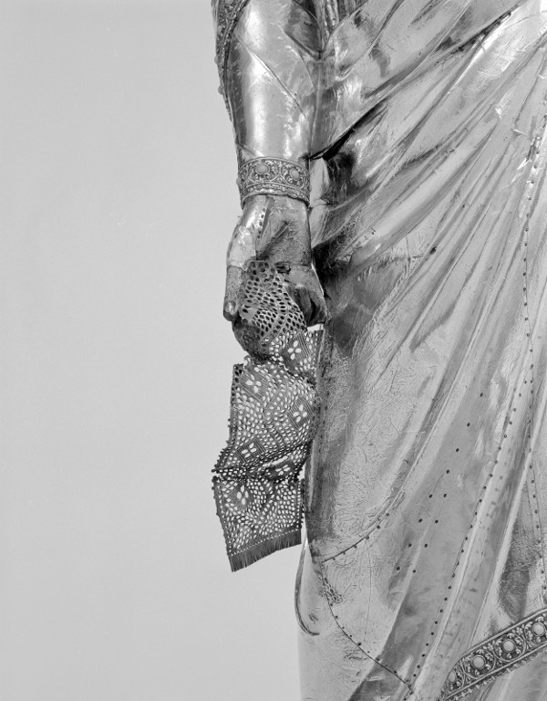 Détail de la main droite de la Vierge et du morceau de ceinture ajourée.Immatriculation