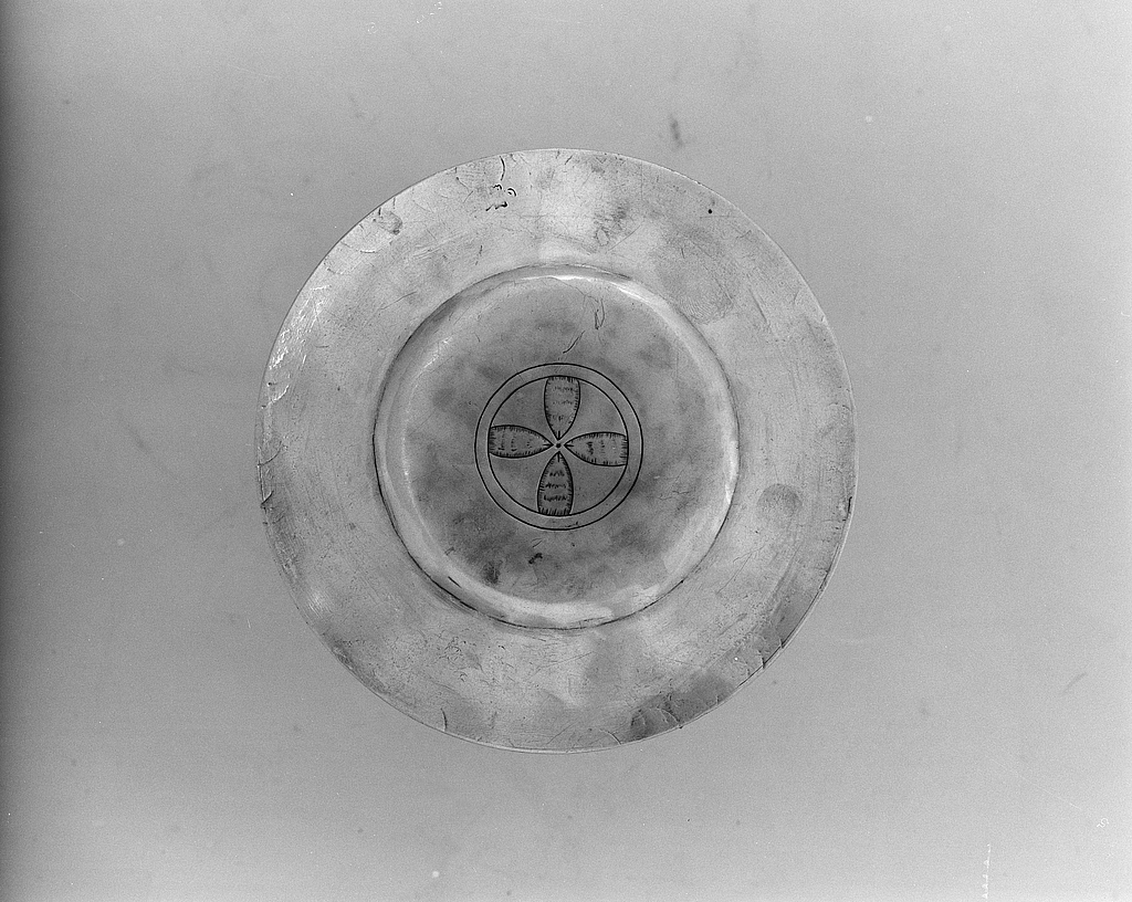 Vue générale de la patène côté gravé.Immatriculation