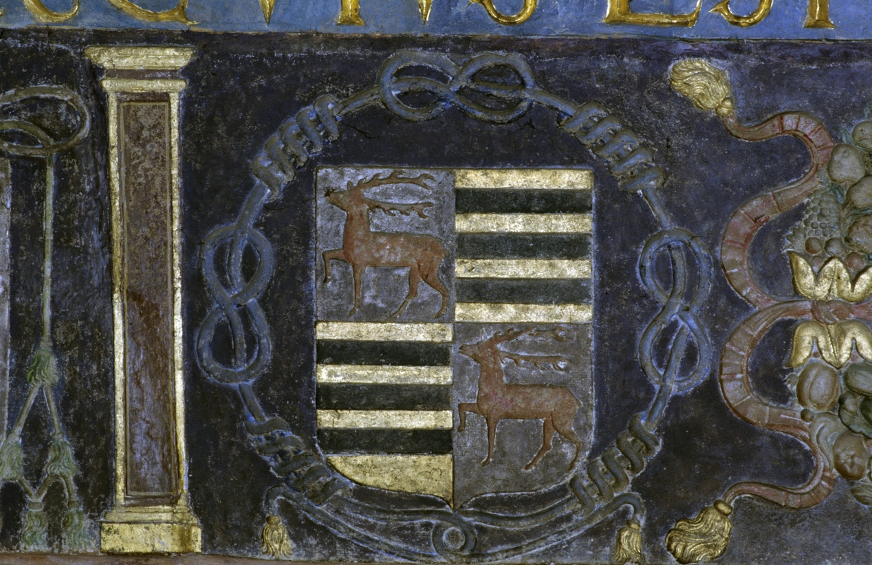 Château, cheminée, partie gauche du linteau : détail d'un blason.Immatriculation