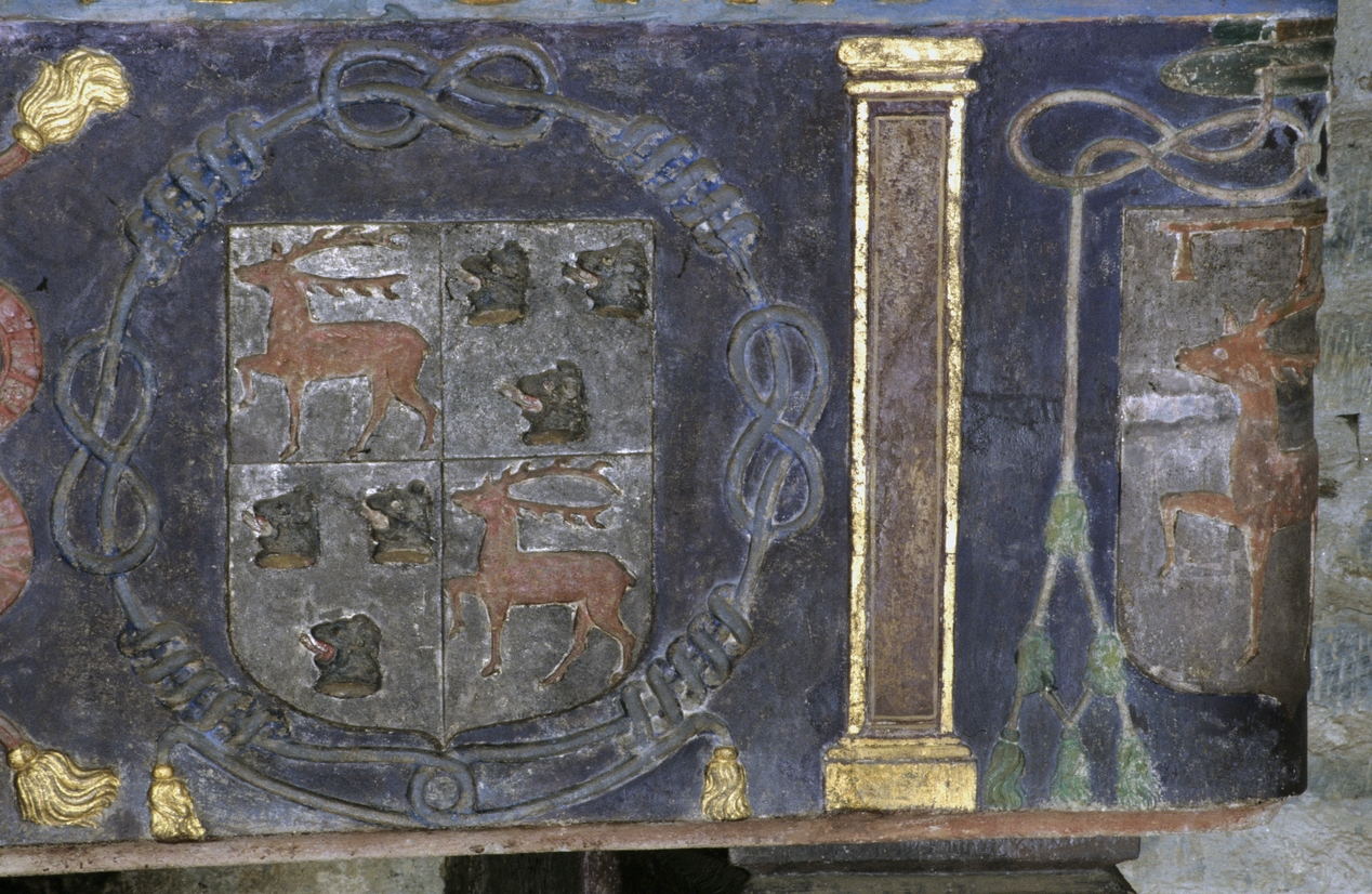 Château, cheminée, partie droite du linteau : détail d'un blason.Immatriculation
