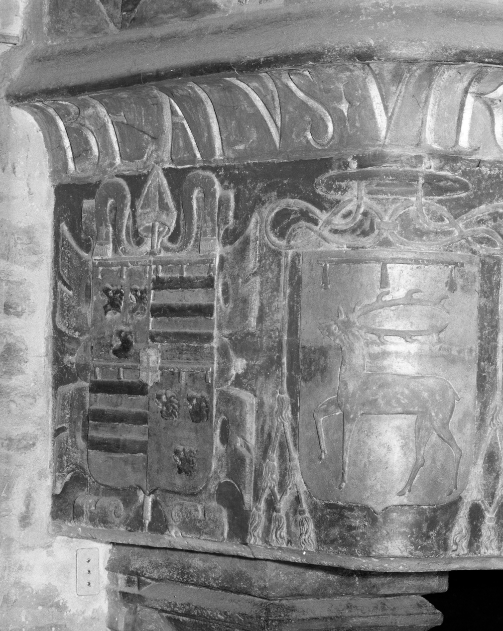 Château, cheminée, côté gauche du linteau : détail d'un blason.Immatriculation