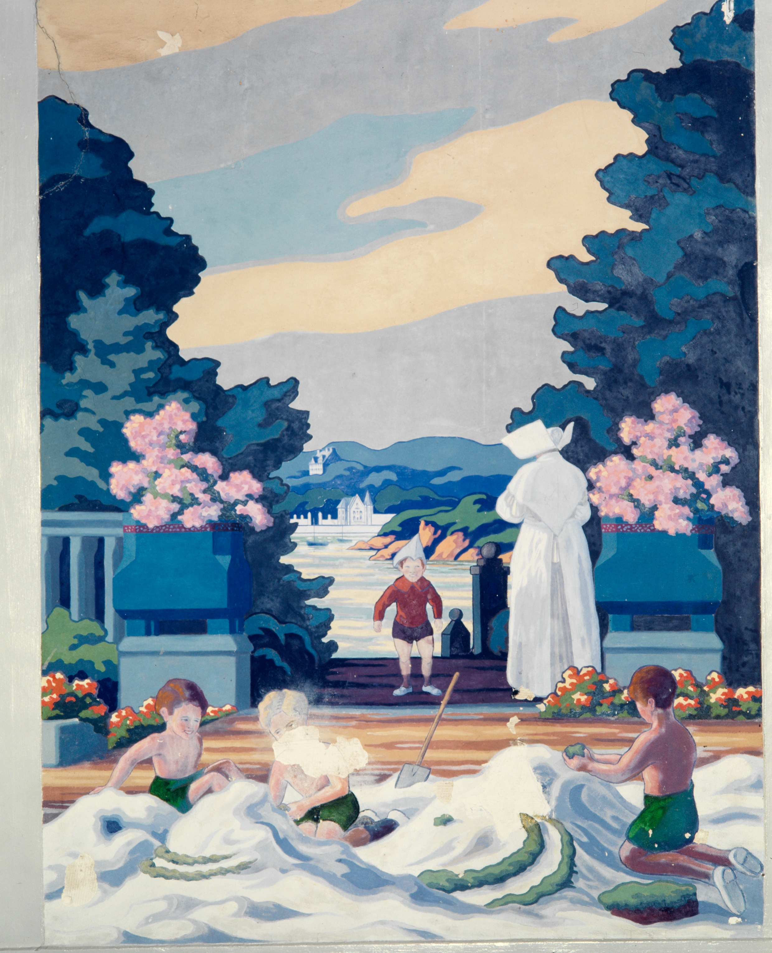 Panneau n°4 : vue générale, enfant jouant sous la surveillance d'une religieuse et paysage de bord de mer en fondImmatriculation