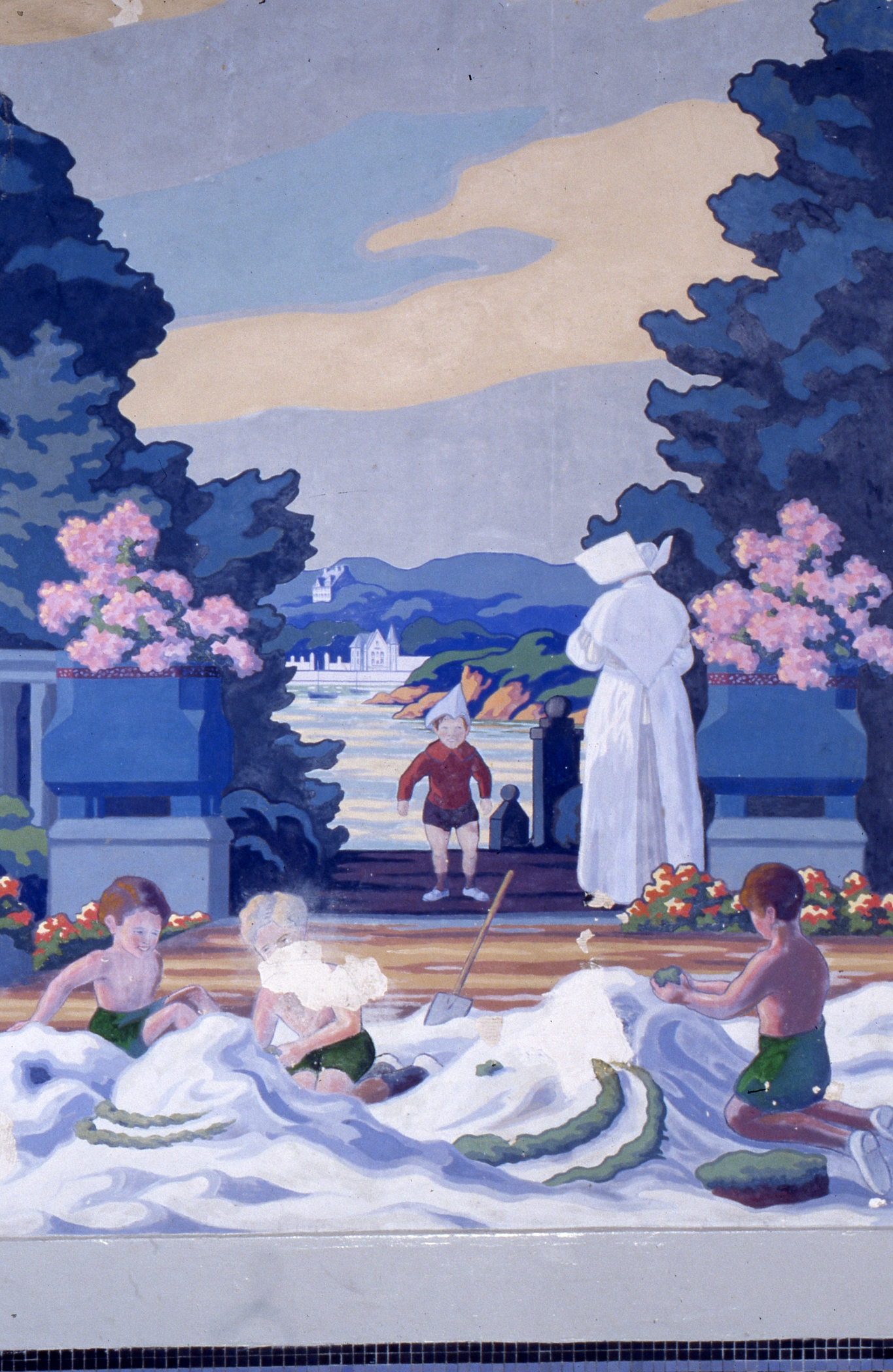 Panneau n°4 : vue générale, enfant jouant sous la surveillance d'une religieuse et paysage de bord de mer en fondImmatriculation