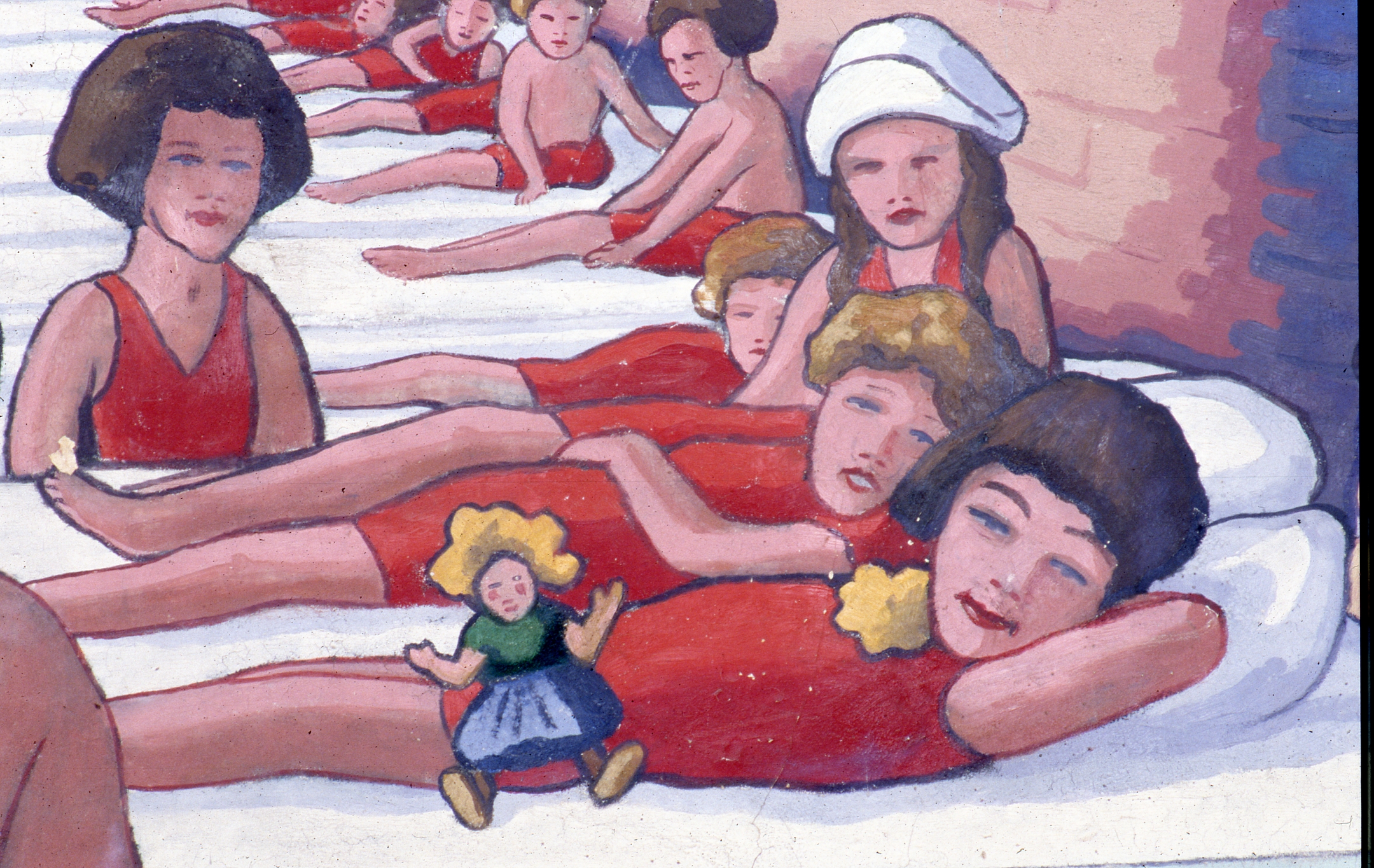 Panneau n°7 : enfants allongés sur la partie droite de la scène, détail.Immatriculation