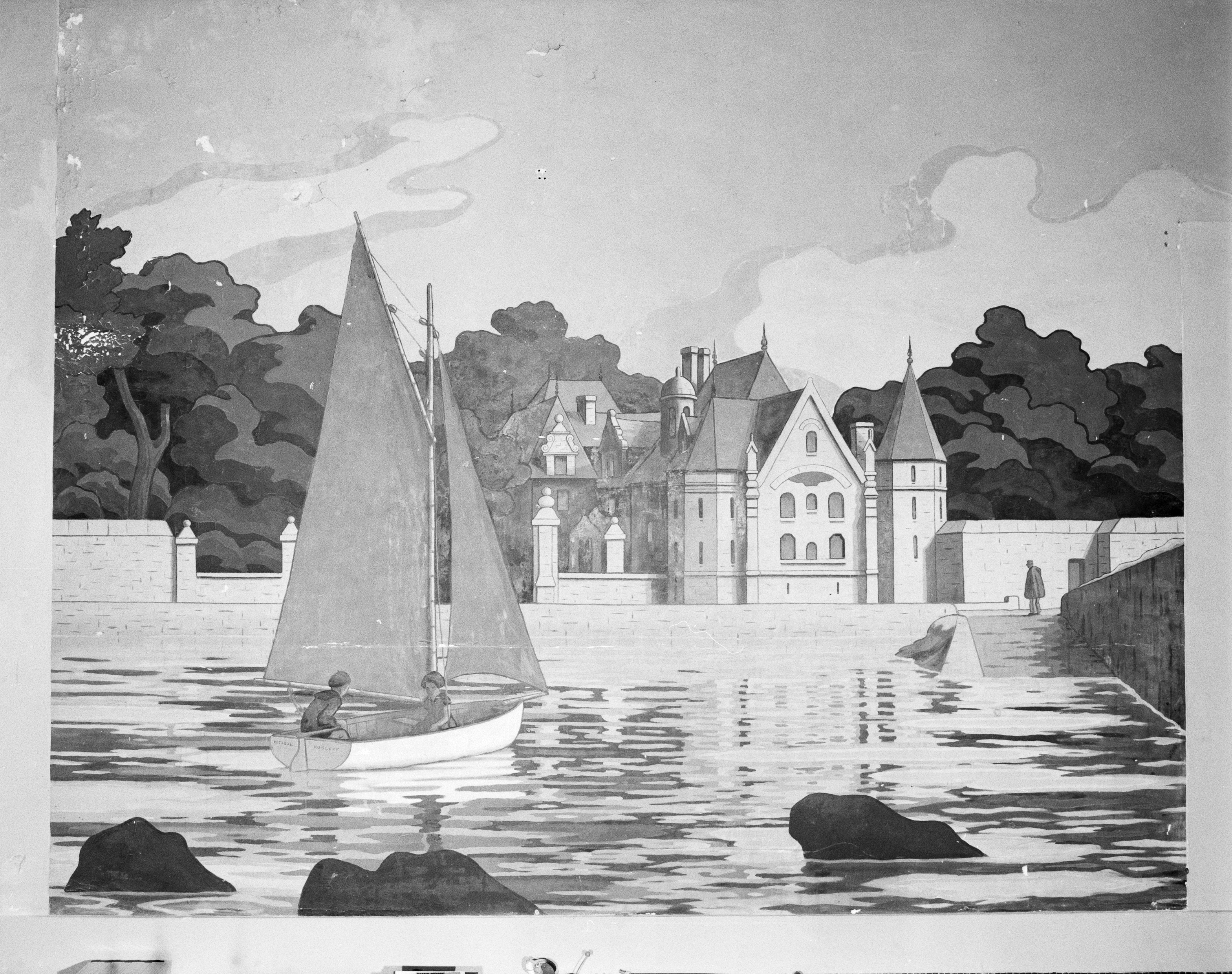 Panneau n°11 : vue générale, enfants sur un voilier devant une demeure au lieu-dit l'AberImmatriculation
