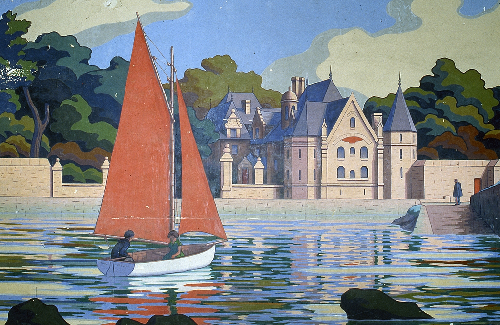 Panneau n°11 : vue générale, enfants sur un voilier devant une demeure au lieu-dit l'AberImmatriculation