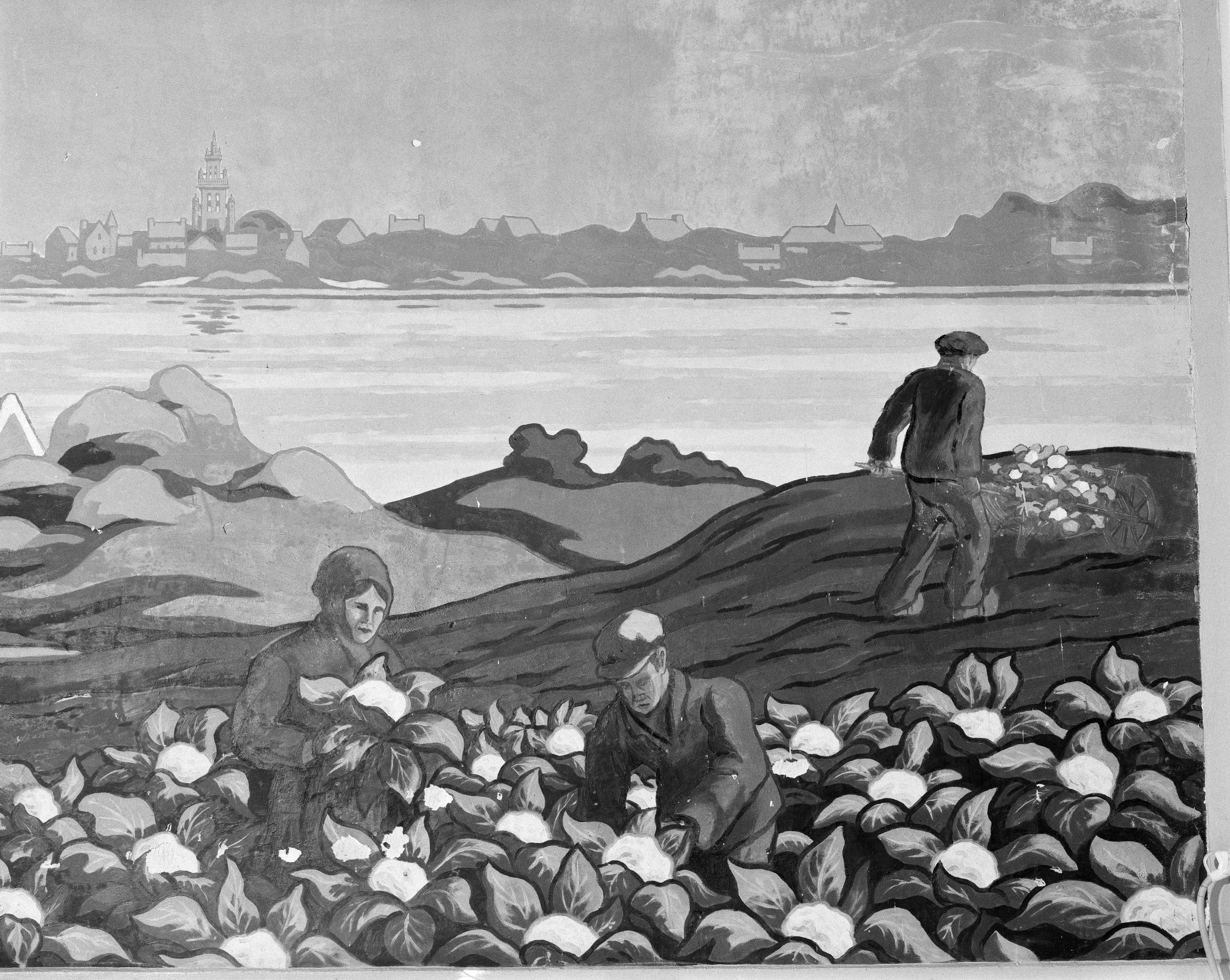 Panneau n°12 : détail de la récolte des choux-fleurs et vue du village de RoscoffImmatriculation