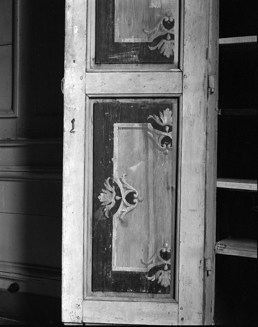 Rez-de-chaussée, chambre nord, détail d'un vantail de placard ouvert, côté gauche.Immatriculation