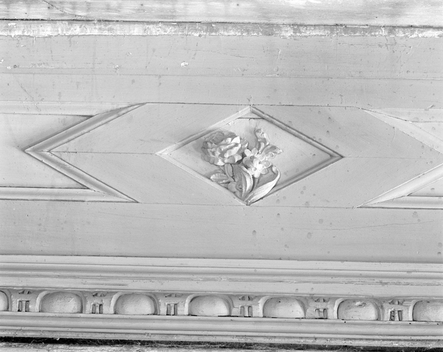 Rez de chaussée : pièce sud, mur sud, détail du lambris au dessus de la cheminée.Immatriculation