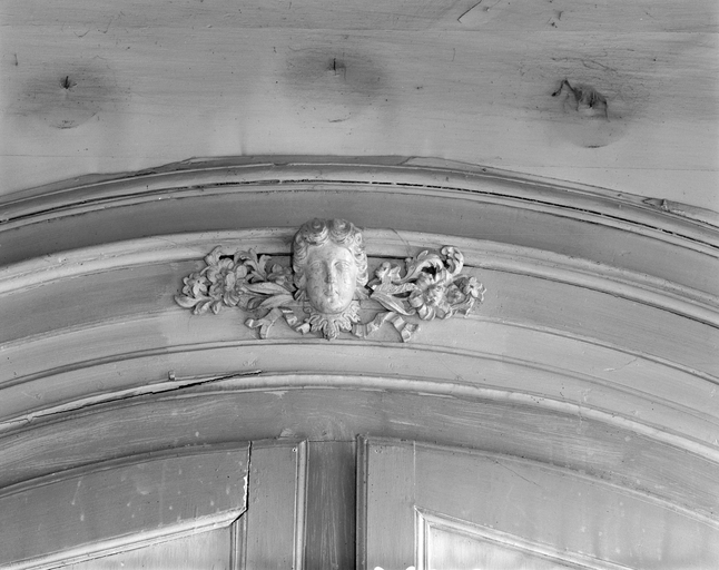 Rez-de-chaussée, pièce sud, mur nord, détail d'un haut-relief surmontant le placard mural.Immatriculation