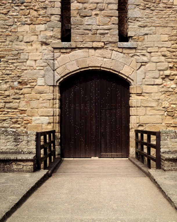 Château fort, logis est, élévation est, détail de la porte.Immatriculation