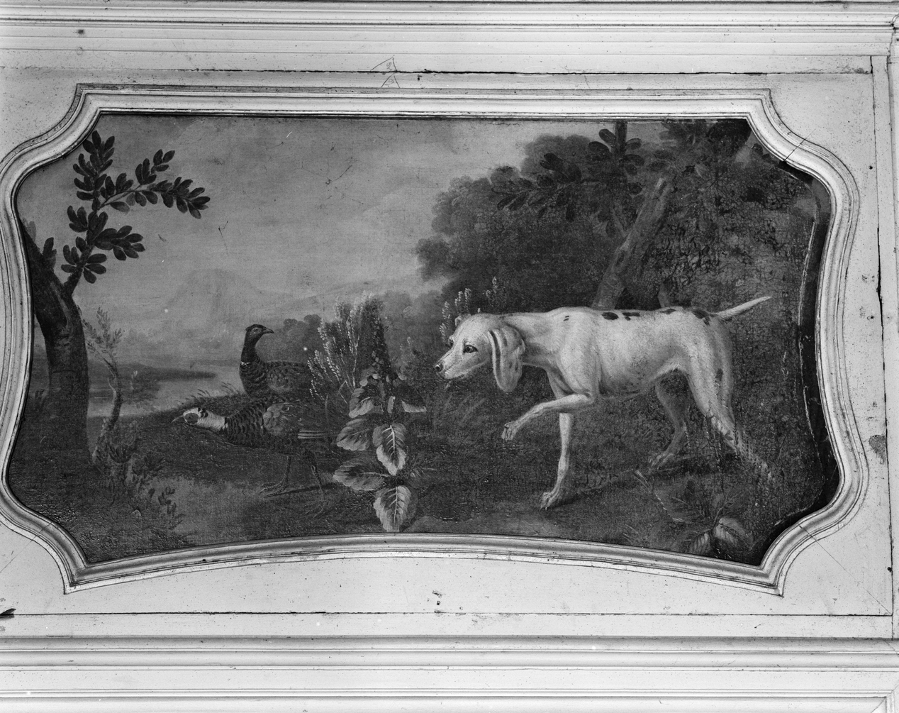 Château, rez-de-chaussée, pièce axiale : grand salon. Trumeau de porte.Immatriculation