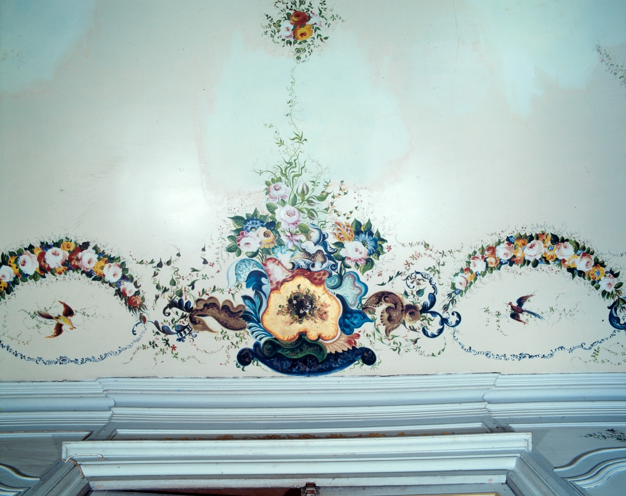 Château, rez-de-chaussée, pièce axiale : grand salon, lambris, décor peint.Immatriculation