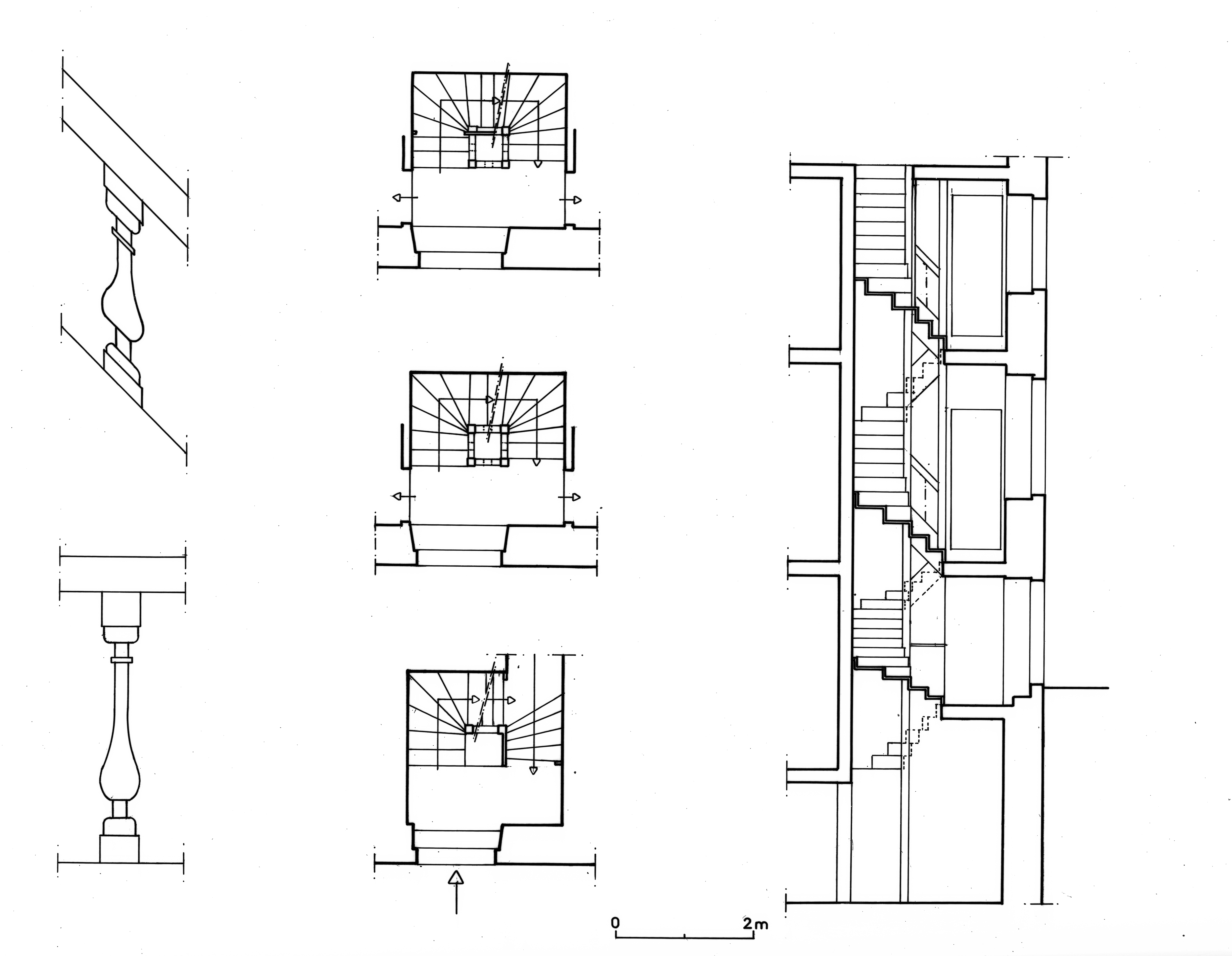 Maison, escalier : coupe, plan et détails des balustres (état en 1994)Immatriculation
