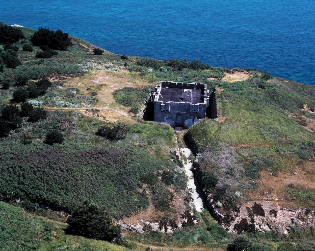 Locmaria, batterie de Kerdonis, corps de garde crénelé, vue aérienne.Immatriculation