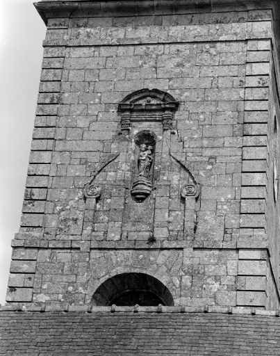 Clocher, 3e niveau, face ouest, statueImmatriculation