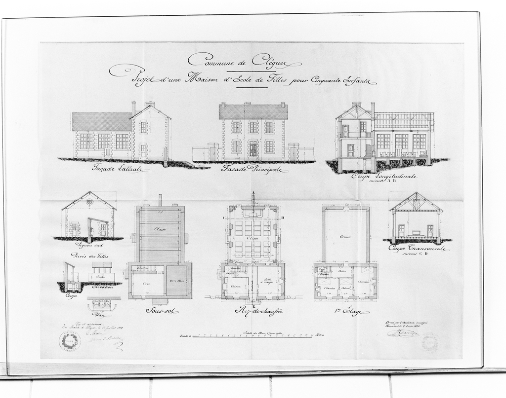 Projet d'une maison d'école de filles, façades latérale et principale, coupe longitudinale, sous-sol, rez-de-chaussée, premier étage.Immatriculation