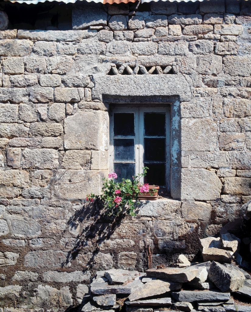 Le Moustoiric. Maison repérée, (R1), détail arc de décharge en chevrons.Immatriculation
