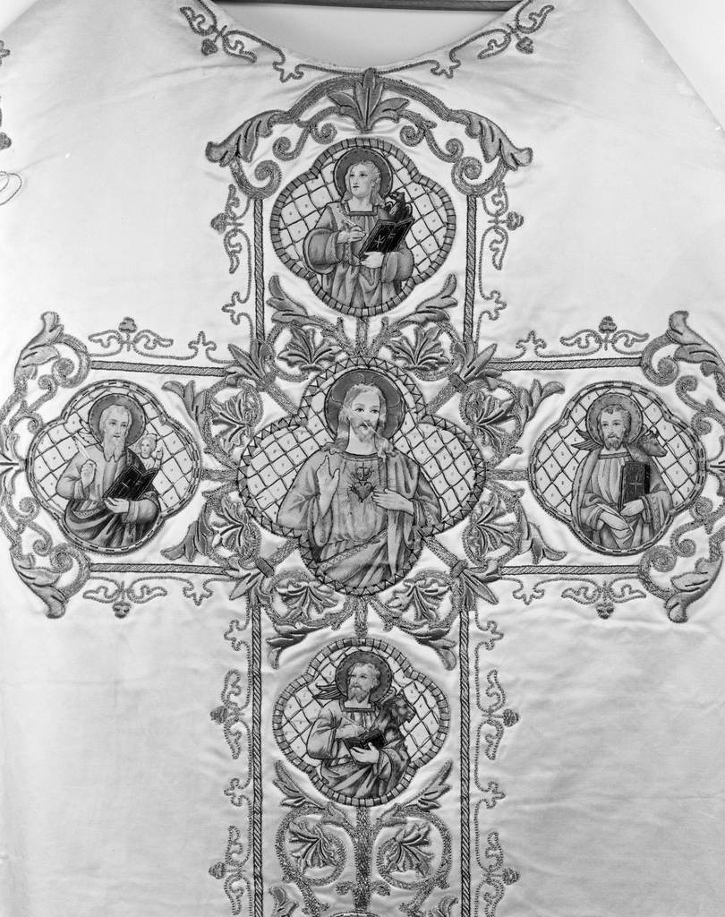 Chasuble, détail des broderies au dos du chasuble.Immatriculation