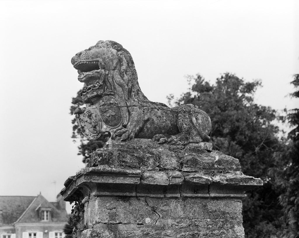 Détail d'un pilier de portail avec lion couché.Immatriculation