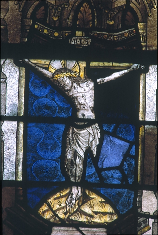 Vitrail - Baie 0, Crucifixion, vue rapprochée.Immatriculation