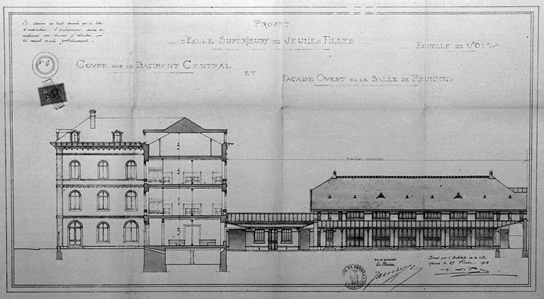 Projet d'école supérieure de jeunes filles, coupe sur le bâtiment central et façade ouest de la salle de réunions, dessin, par Leray, 1913 (A. C. Rennes).Immatriculation
