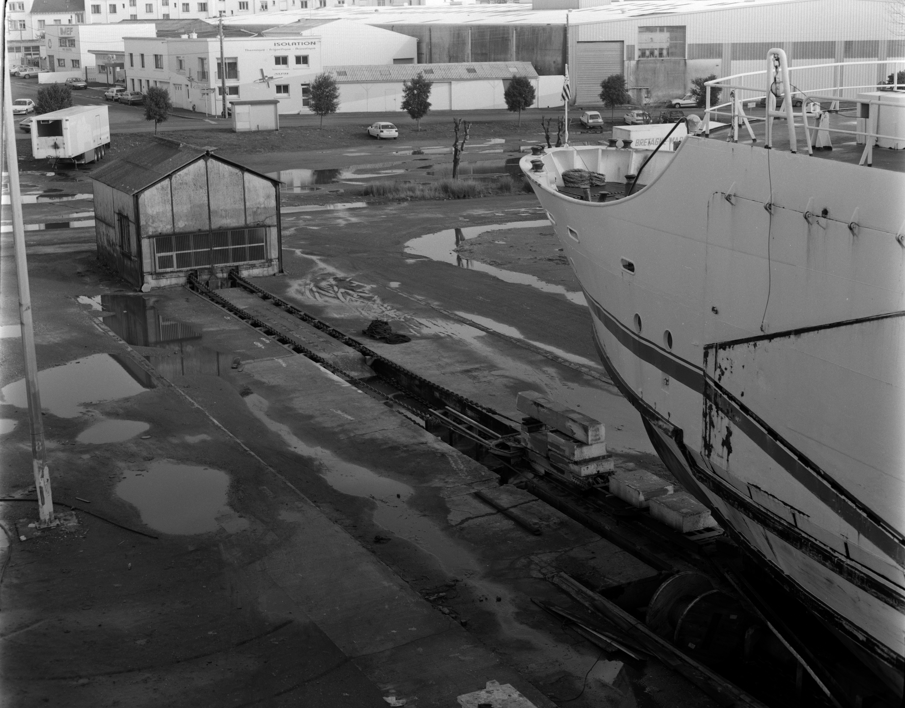 Vue de la troisième ligne de réparation navale en 2000. Dans l'axe de la voie, le bâtiment abritant le treuil de hissage à chaîneImmatriculation