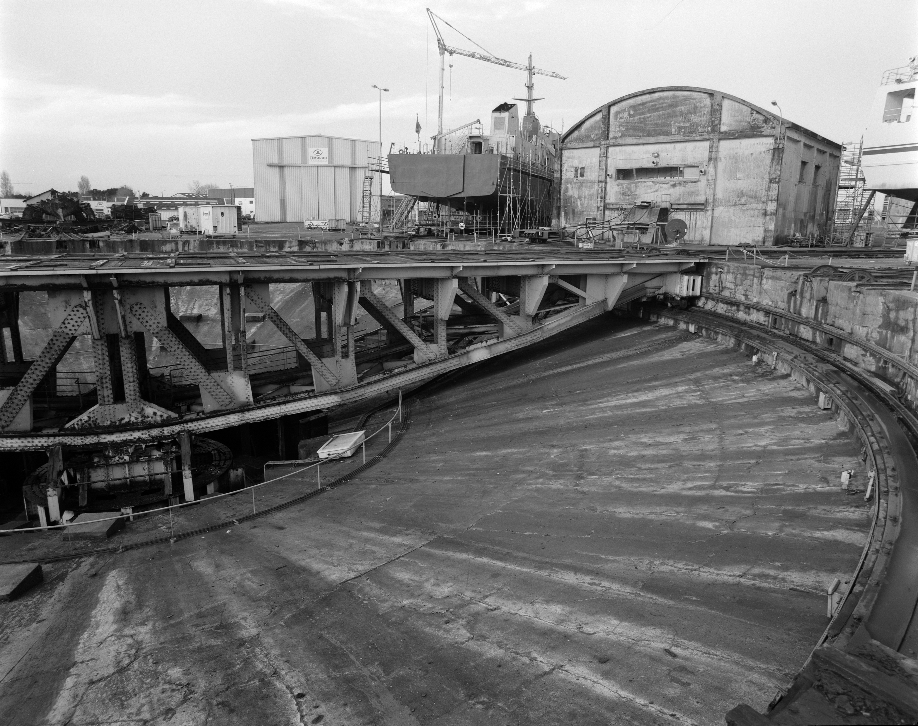 Vue du pont basculant et tournant dans sa fosse bétonné en 2000. Au droite, le bâtiment abritant le treuil de hissage principal du slipwayImmatriculation