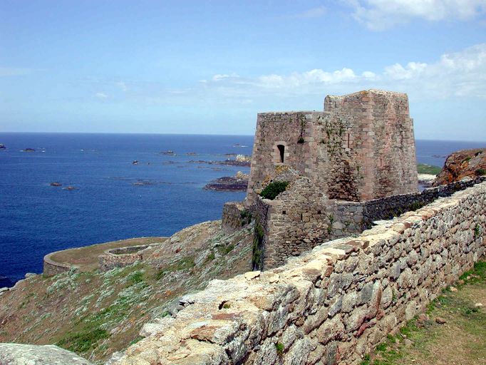 Perros-Guirec, fort de l'île aux Moines : vue de l'enceinte du fort (au premier plan), du corps de garde, de la redoute et de la batterie Ouest de l'îleImmatriculation