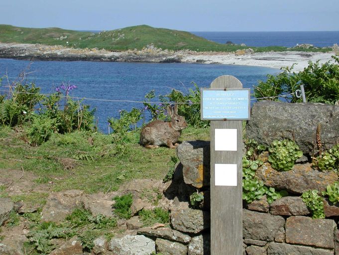 Vue de détail du parapet et de la signalétique (état en 2002). L'île est occupée par des lapinsImmatriculation