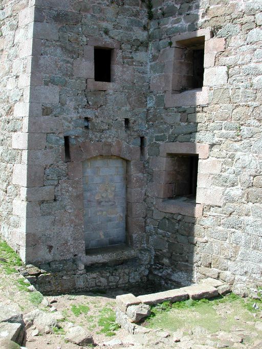 Vue de l'entrée fortifiée de la redoute, réduit de l'île aux Moines : deux baies flanquent l'entrée ainsi qu'un assommoir au dessus de la porteImmatriculation