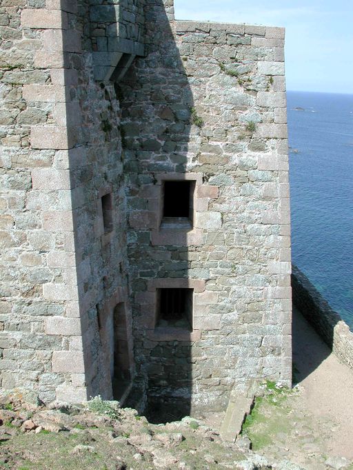 Vue de l'entrée fortifiée de la redoute, réduit de l'île aux Moines : deux baies flanquent la porte ainsi qu'un assommoir et une bretèche au dessus de la porteImmatriculation