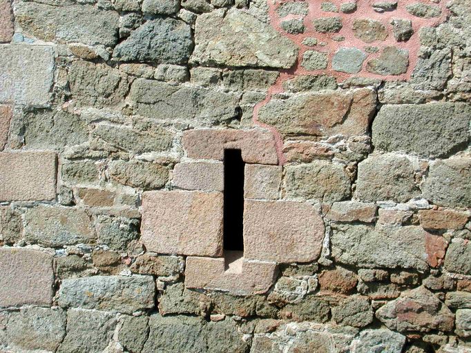 Vue de la meurtrière de la façade est de la redoute, réduit de l'île aux Moines. Cette meurtrière flanque le rocher en cas d'attaque par la gorgeImmatriculation