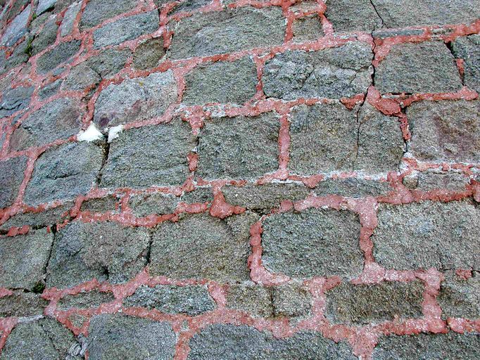 Perros-Guirec, fort de l'île aux Moines : détail de l'appareillage des pierres de la redoute de l'île aux Moines. La couleur rosée du joint vient de l'adjonction dans le mortier de poudre de briqueImmatriculation