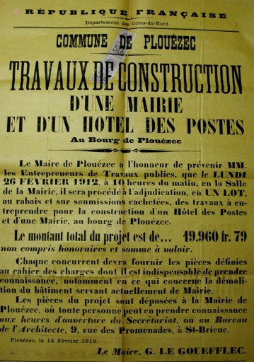 Annonce de la construction de la mairie et de l'hôtel des Postes (AD 22).Immatriculation