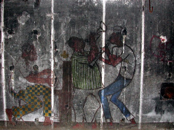 Vue d'une peinture murale dans l'un des bunkers de la pointe de Penn al Lann : scène de concert (de jazz ?) peinte par des soldats américains lors du débarquement en baie de Morlaix en août 1944Immatriculation
