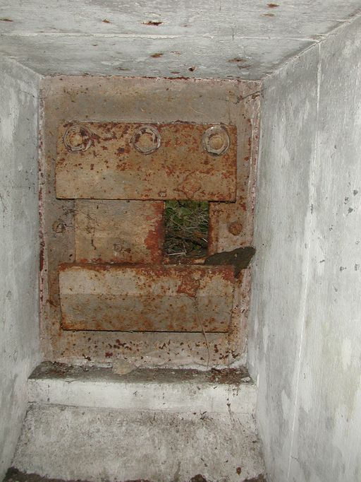 Vue intérieure d'un créneau de défense (état en 2002). Le volet blindé est en placeImmatriculation