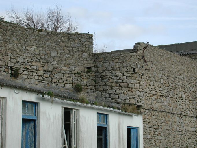 Vue du mur en moellon de granite et de la tour occidentale depuis l'ouest (état en 2002). Au premier plan, l'un des bâtiments des viviersImmatriculation