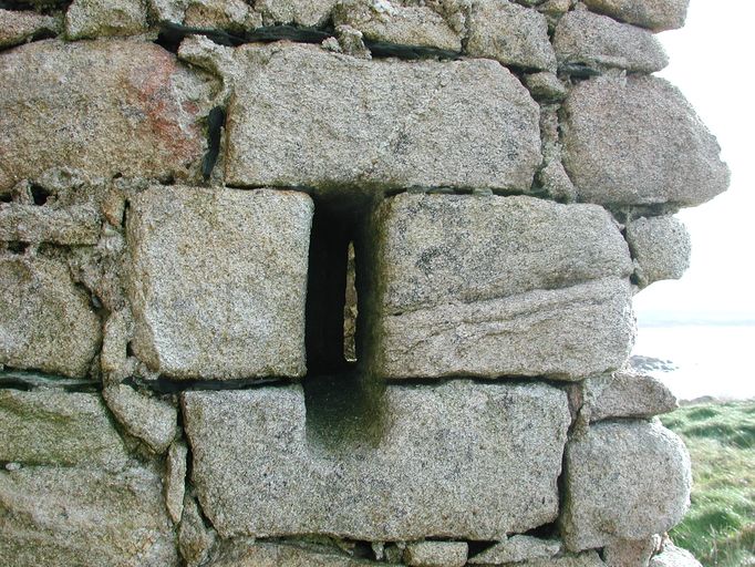 Santec, Ile de Sieck : vue d'une des deux ouies d'aération en chicane de la petite poudrière adossée au pignon du corps de gardeImmatriculation